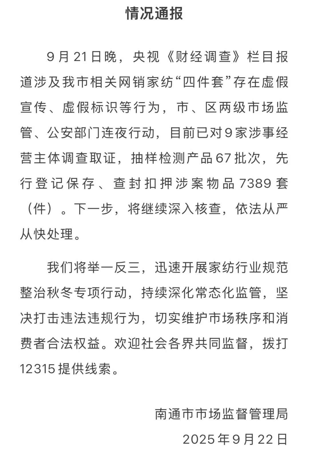 南通通报家纺“四件套”涉虚假宣传:对9家涉事经营主体调查取证,查封扣押