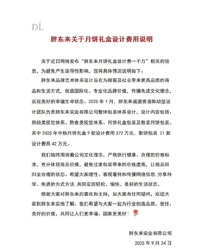 9月24日晚,胖东来实业有限公司发布声明,关于近日网络发布“胖东来月饼礼盒设计费一千万”相关的信息,为避免产生误导性影响,现将具体情况说明如下: 胖东来品牌艺术体系设计旨在为顾客及社会带来更高品质的商品和生活方式,创造国际化、专业化品牌价值,传播先进文化理念,实现美好的幸福生命状态。2025年1月,胖东来诚邀香港陈幼坚设计团队负责胖东来实业有限公司整体包装体系设计,设计内容包括:烘焙类视觉体系、熟食类视觉体系、月饼礼盒包装及散装月饼包装。其中2025年中秋月饼礼盒9款设计费用372万元,散饼包装21款设计费用42万元。 胖东来称,其严格执行健康、合理的价格标准,充分体现商品价值,避免过度包装带来的价格虚高,让商品回归至合理的状态。希望大家理性、客观看待和传播网络信息,分享科学、先进的方式方法,共同实现轻松、愉快、美好的生活状态。 ![]() ![]() 此前,有网友在社交平台发文称,胖东来今年自营月饼礼盒,光包装设计就花费了上千万元。 9月22日,记者以消费者身份,致电胖东来多个门店,时代广场门店工作人员回应称,今年月饼包装是请专门团队设计的,费用肯定是不低,但具体是多少不清楚。 9月19日,胖东来官方账号曾发布作品,介绍自营月饼包装盒由中国香港陈幼坚团队设计。此外,工作人员还表示赏月礼盒系列(即包装盒是会跳动的兔子款)已经断货了,补货时间无法确定。据胖东来官方文件显示,DL自营月饼礼盒每盒售价97元至350元不等。 ![]() 据公开资料显示,胖东来推出的自营产品“胖东来大月饼”曾爆火,有芋泥麻薯酥和红豆蛋黄酥两种口味,售价为29.8元/个。 ![]() |