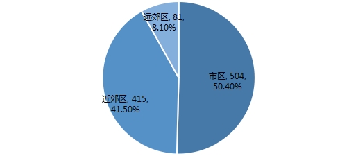 图:性别构成 (二)居住地分析 从居住地上看,504人居住在市区(东城区、西城区、朝阳区、海淀区、丰台区、石景山区),占比50.40%;415人居住在近郊区(门头沟区、房山区、通州区、顺义区、昌平区、大兴区),占比41.50%;81人居住在远郊区(平谷区、怀柔区、密云区、延庆区),占比8.10%。