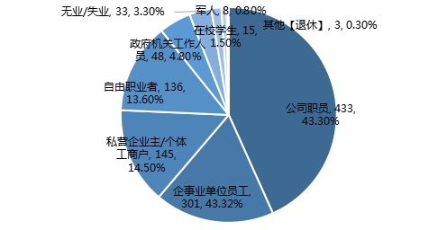 图:教育程度构成 (五)职业分析 从职业分布上看,公司职员433人,占比43.30%;事业单位工作人员179人,占比17.90%;私营企业主/个体工商户145人,占比14.50%;自由职业者136人,占比13.60%;政府机关工作人员48人,占比4.80%;无业/失业33人,占比3.30%;在校学生15人,占比1.50%;军人8人,占比0.80%;选择其他(退休)3人,占比0.30%。