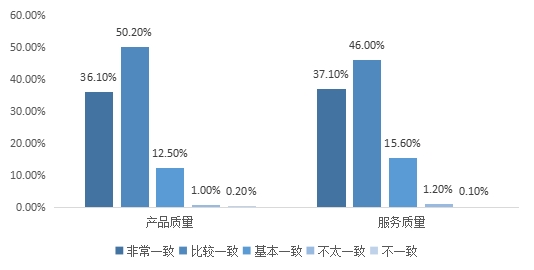 图:维修情况分析 (十三)产品质量问题诉求 调查结果显示,调查对象对遭遇的汽车产品质量问题的诉求主要集中在以下三点:一是希望汽车厂家能够提升技术水平,注重汽车整体质量的提高,重点关注汽车安全性能;二是要加强品质改革,增强责任意识,保障汽车产品质量;三是要把握维修的及时性和便捷性,多关注价格、服务态度、维修水平、服务流程等环节,切实保障好消费者的合法权益。 (十四)一致性分析 在汽车品牌产品质量的期望一致性调查中,36.10%认为非常一致,50.20%认为比较一致;12.50%认为基本一致;认为不太一致和不一致的人数较少,占比分别为1.00%和0.20%;在品牌整体服务质量的期望一致性调查中,37.10%认为非常一致,46.00%认为比较一致;15.60%认为基本一致;认为不太一致和不一致的人数较少,占比分别为1.20%和0.10%。