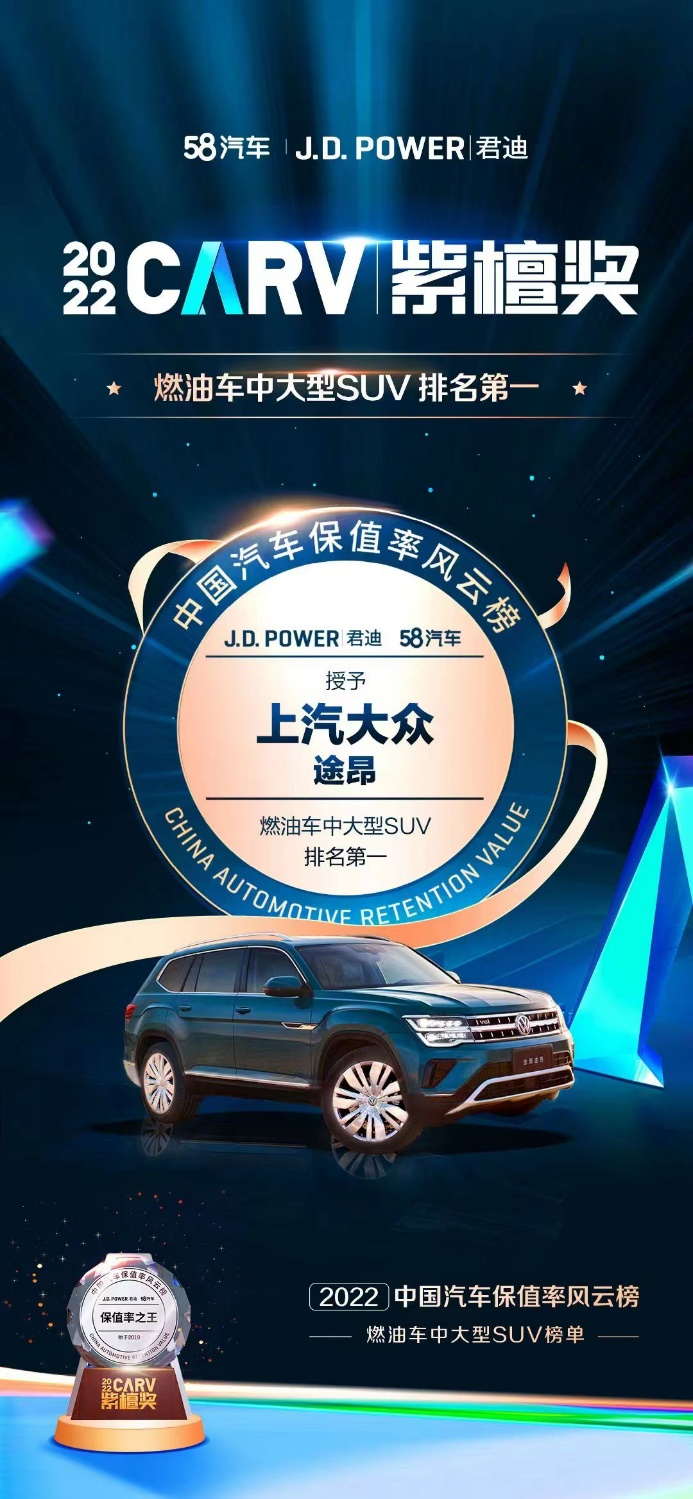 近日,58汽车联合J.D. Power颁布“紫檀奖·2022中国汽车保值率风云榜”发布,上汽大众途昂获得燃油车中大型SUV排名第一。