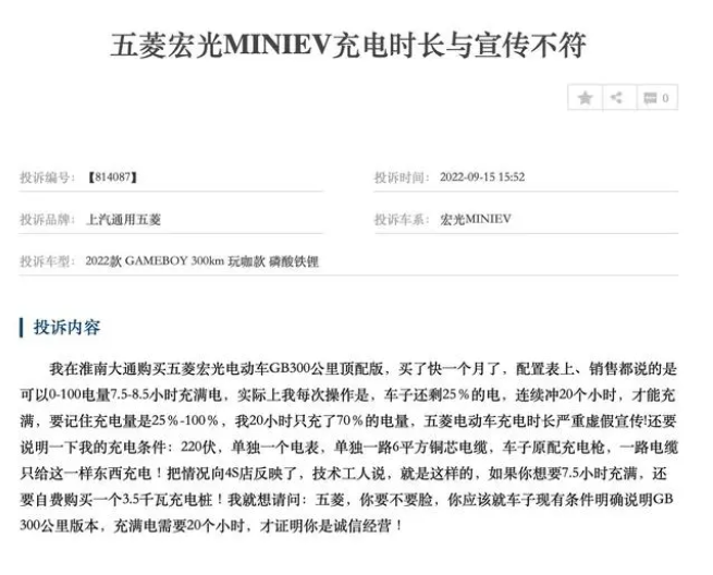 消费者反映,当时在淮南大通购买五菱宏光电动车GB300公里顶配版,买了快一个月了,配置表上、销售都说的是可以0-100电量7.5-8.5小时充满电,实际上每次操作是,车子还剩25%的电,连续冲20个小时,才能充满,要记住充电量是25%-100%,该车主认为,其20小时只充了70%的电量,五菱电动车充电时长严重虚假宣传。