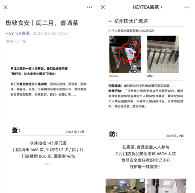 (图:喜茶对外公示日常食安管理信息) 对于自查中产生的问题,喜茶也会公示具体的细节以及解决方案,并以直观的图文方式展现给消费者,接受消费者监督。比如,在2月份的食安自查中,喜茶杭州国大广场店发现备料间的员工未把手机放在指定位置,容易引发食安风险。门店在发现后立即要求员工将手机放回指定区域内。同时值班经理也重新向员工进行了食安培训,宣讲个人物品管理要求,要求员工不得将个人物品带入食品操作区、仓库等区域内。 喜茶严格的食安管理不仅获得了消费者点赞,也获得了监管部门的认可。据悉,2023年一季度喜茶全国众多门店接受并通过政府检查。