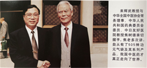 中顾委委员、原卫生部部长钱信忠题词:“勤于考察,精心撰著,播洒爱心,造福人类。” 中国科学院院士、世界卫生组织传统医学顾问陈可冀教授为来辉武题词:“惠泽病家,为善最乐。” 陈可冀教授在《来辉武成功之路》的序言中写到:“来辉武同志的可贵精神就在于他的朴实无华,忘我忘家,没有星期天和节假日,从钻研祖国传统医药学,深山采药,含辛茹苦,到不断革新,改进和提高制剂质量,提高疗效,都作了大量的工作,付出了艰辛的劳动;他的这种开拓精神和进取精神,就是他成功的奥秘!”人为万物之灵。来辉武同志的灵在于情系弘扬传统医药学,情系诊治患者病苦,情系为祖国争光;他谱写出了星火乐章,产品驰名大江南北,远销海内外。来辉武同志特有的风采和气质还在于他一心一意为社会和他人多作贡献。 全国中药学会理事长、卫生部中药审评委员会主任委员、北京中医药大学王绵之教授为来辉武总裁题词:“继往开来,辉我岐黄,亦文亦武,日新月昌。” 世界卫生组织医学咨询团顾问、中国医学科学院药用植物资源开发研究所所长、世界卫生组织传统医学合作研究中心主任肖培根教授为来辉武题词:“神奇异功,元壮气充”;“光辉灿武”。 中日友好医院专家室副主任、国家中医药管理局、中华全国中医学会常务理事、中华全国中医学会、中华人民共和国药典委员会委员、国家卫生部药品审评委员会委员、北京中医学院名誉教授焦树德教授为来辉武题词:“精研岐黄,为人类健康做贡献”。并在许多场合深有感慨地讲:“自从有了505神功元气袋及系列产品,中医药才真正地走向了世界!” 全国人大代表、中国中医药学会常务理事、著名中医专家刘渡舟教授为来辉武题词:“保养元气”。 国内外有许多人研究505现象,因505是天地之数,济世救人数千万。505神功元气袋及系列产品保健效果惊奇。根据阴阳五行学说,扶正祛邪,“正气内存,邪不可干”,芳香避秽,可以预防瘟疫。 来辉武一贯倡导忠孝诚信、求实创新、团结奋进,人民才能幸福快乐。他的突出特点就是济世救人、雪中送炭,从不搞锦上添花。常常救助失学儿童,救助留守儿童,救助弱势群体。來教授被国内外许多媒体誉为红色慈善家。他创办的505精神的核心就是济世救人、救死扶伤、忠孝诚信、求实创新、团结奋进、幸福快乐、雪中送炭、吃亏是福、严以律己、宽以待人。他曾与多位主要领导人多次深入交流探讨中国特色的社会主义,为国家谋未来,为中华民族谋发展、为人民群众谋幸福,全心全意为人民服务,奋力拼搏。 來教授常讲,心态决定一切,心胸有多大,事业就能做多大,要身心健康,就要忘记年龄、忘记疾病、忘记恩恩怨怨。他心胸广阔,乐善好施,喜于助人,朋友遍天下,也有伤害他的人,但他不计前嫌,经常化敌为友,给予支持帮助。他心里从来没有敌人,只有朋友和兄弟。 胸怀千秋,坦荡万里。來教授高超的处世智慧值得我们每一个人学习借鉴,引领我们做一个有益于社会、有益于他人的人。 |