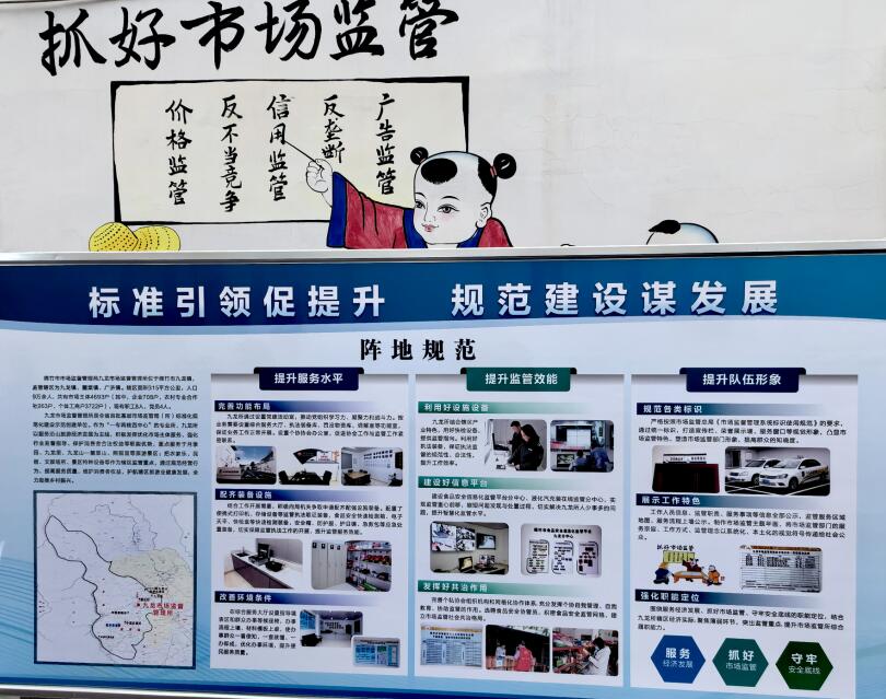 经过多方研究,将有着千年历史深受巴蜀人民喜欢的绵竹年画,作为载体融入日常宣传普及教育中。让群众从“被动了解监管办法”向“主动学习市场规章”转变。同时,开展线上铺开式宣传。精心创作“年画娃娃”系列表情包、H5等新媒体产品,将市场监管部门的服务宗旨、监管理念以系统化、本土化的视觉符号传递给社会公众,以创新的方式塑造了市场监管形象的同时,为建设统一大市场做出具有绵竹特色的贡献。 据悉,目前,绵竹市局及下辖九龙市场监管所分别被确定为全省首批“两化”建设“示范局”“示范所”创建单位,九龙所作为全国五星所评定候选单位已被推荐到市场监管总局。 更放心! 夯实做强基础 携手统筹推进 “我们九龙市场监督管理所位于绵竹市九龙镇,监管辖区为九龙镇、麓棠镇、广济镇。共有市场主体4717户,其中,企业720户,农村专业合作社263户,个体工商户3734户。如此众多的个体工商户以及流动摊点,不仅连接着摊贩的生计,是稳定和扩大就业的重要支撑,还关乎民众生活的获得感。”九龙所所长刘思言对辖区情况了如指掌。 在该所的办公区,记者注意到,所有工作人员的信息全部公开,职责分工醒目,服务内容一目了然,工作计划、月度工作重点清晰的梳理在墙上,所里每一个人都要对标打卡,按时推进,做到对标督导,提升工作质效。