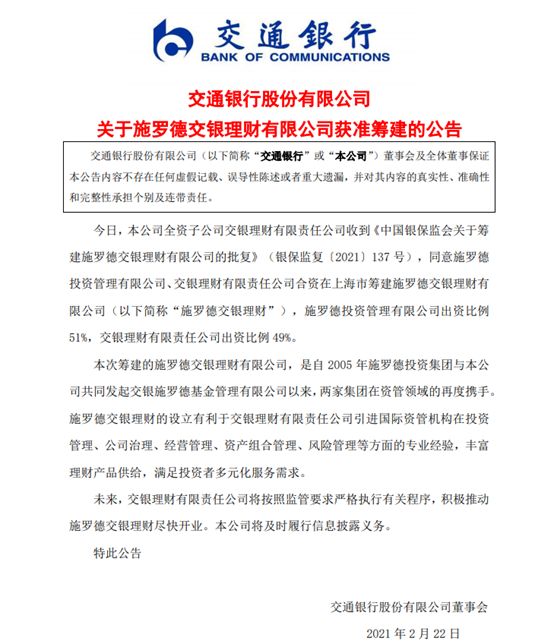 第三家外资控股理财公司亮相 施罗德交银获准筹建