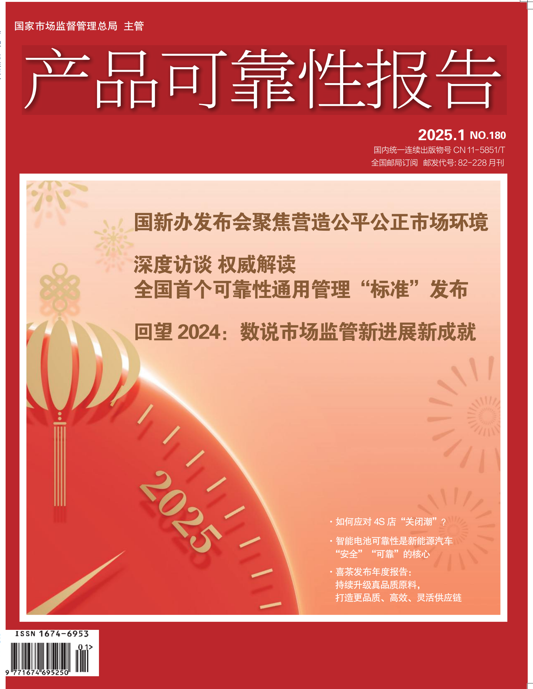 【封面报道】回望2024:数说市场监管新进展新成就;【特别关注】国新办发布会聚焦营造公平公正市场环境;【权威解读】全国首个可靠性通用管理“标准”发布 12 京津沪渝质量可靠性创新实践协作机制,由四地增至京津沪渝鲁闽赣7省市联动;【质量报告】市场监管总局公布多起网络不正当竞争典型案例;【可靠观察】智能电池可靠性是新能源汽车“安全”“可靠”的核心;【消费之音】保健品市场规模超三千亿;银发族和90后为消费主力军。