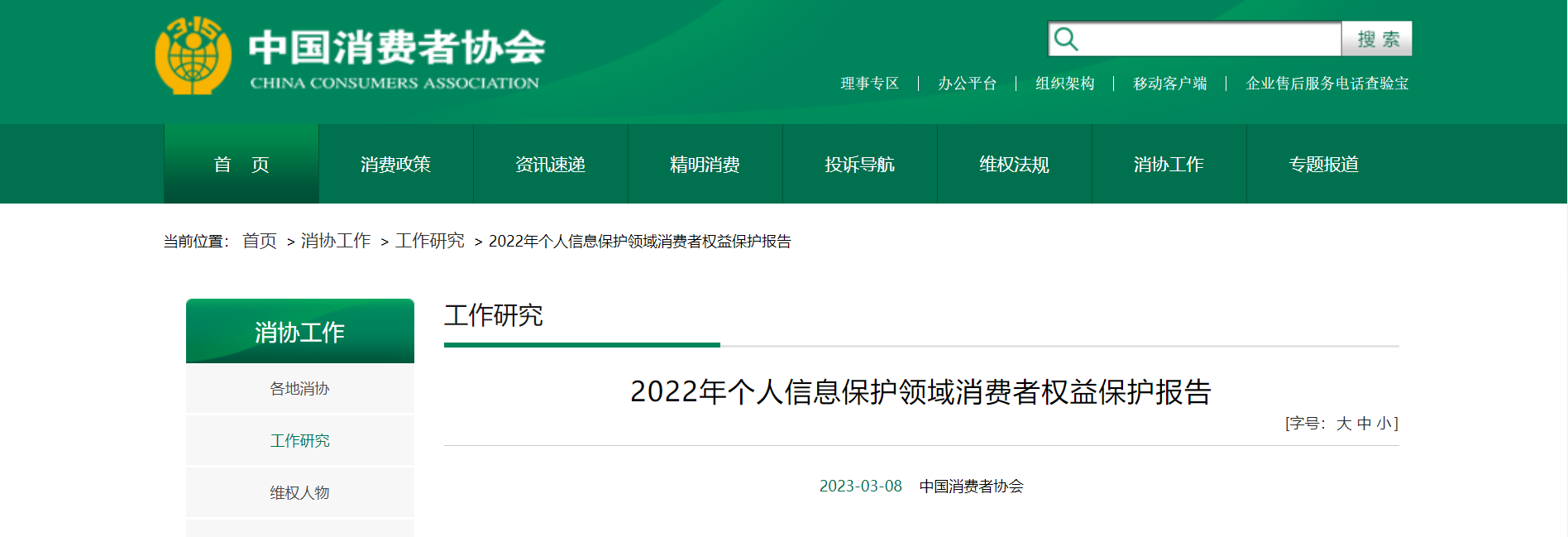 中消协发布《2022年个人信息保护领域消费者权益保护报告》